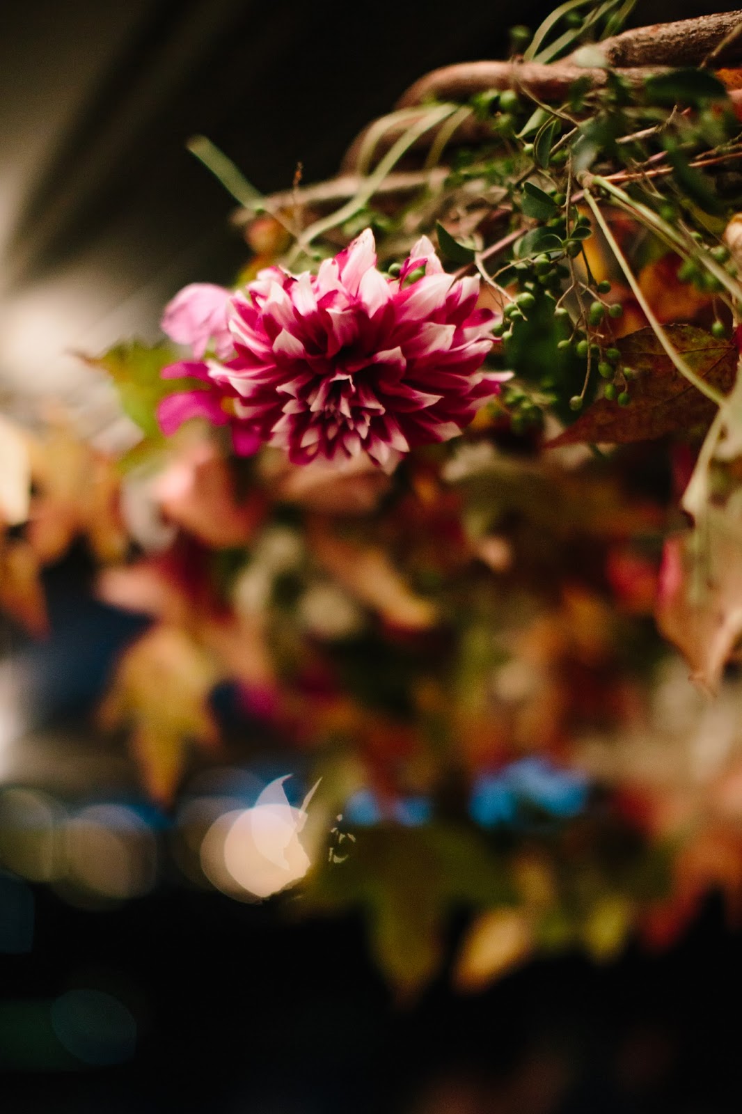 While the bouquets and buttonholes were more neutral to tie in with the gorgeous dresses and suits, we went a bit crazy with beautiful warm autumnal colours at the reception - lots of deep pinks, greens and whites.