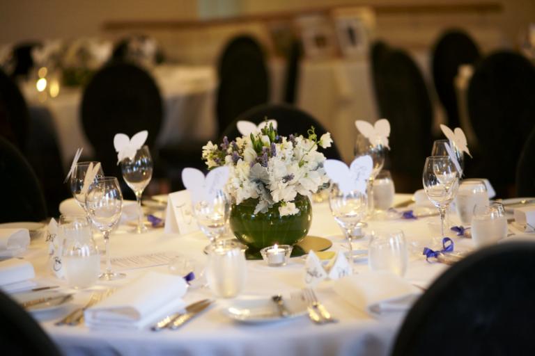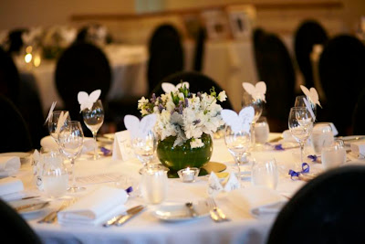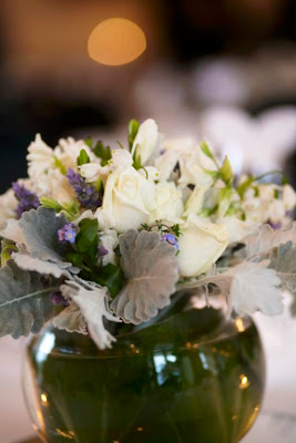 Similar flowers to the bouquets were placed on the tables in large fishbowls, surrounded by lots of candles to warm the room on the winter's day.