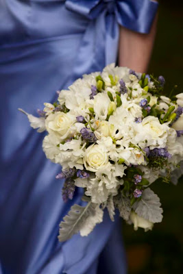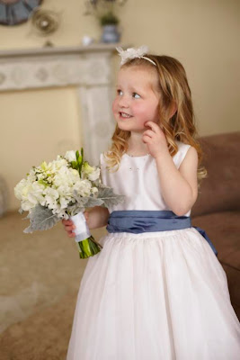 The colour scheme for the flowers was blue and white, given the stunning blue bridesmaid's dresses. Lavendar and forget me nots went perfectly with the white sweet peas, freesias, roses,hyacinth, and pretty snowdrops all tied in beautifully with fragrant herbs and dusty miller.
